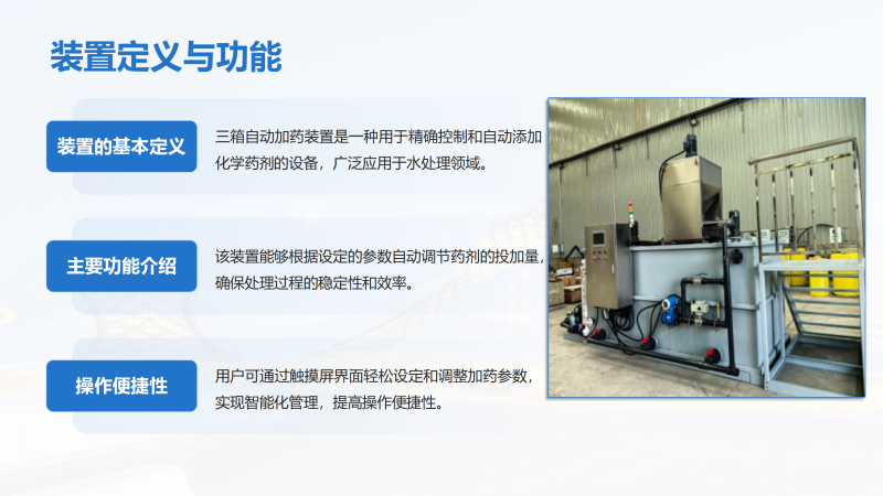 我們提供的全自動三箱加藥裝置,可以精確控制藥劑投加量,確保飲用水的處理效果。同時,裝置具備自動監(jiān)測和反饋功能,能夠在關(guān)鍵指標(biāo)出現(xiàn)問題時自動報警,大幅減少人工干預(yù)的需求。