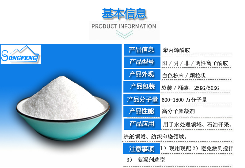 非離子聚丙烯酰胺PAM類絮凝劑由于不帶離子型官能團,因此,與陰離子型PAM類絮凝劑相比具有以下特點:絮凝性能受廢水pH值和鹽類波動的影響小;在中性或堿性條件下,其絮凝效果(沉降速度)不如陰離子型,但在酸性的條件下卻優(yōu)于陰離子型;絮體強度比陰離子型高分子絮凝劑的強.